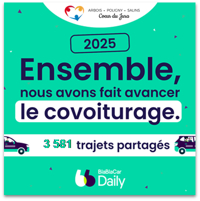 Avec le partenariat entre la CCAPS Coeur du Jura et BlaBlaCar Daily, initié en septembre 2024, les trajets à destination et au départ du territoire Coeur du Jura pour se rendre où bon vous semble, pour une distance de minimum 2km et maximum 80km, sont entièrement gratuits pour les passagers, et le conducteur gagne 1,50€ à 3€ par trajet.